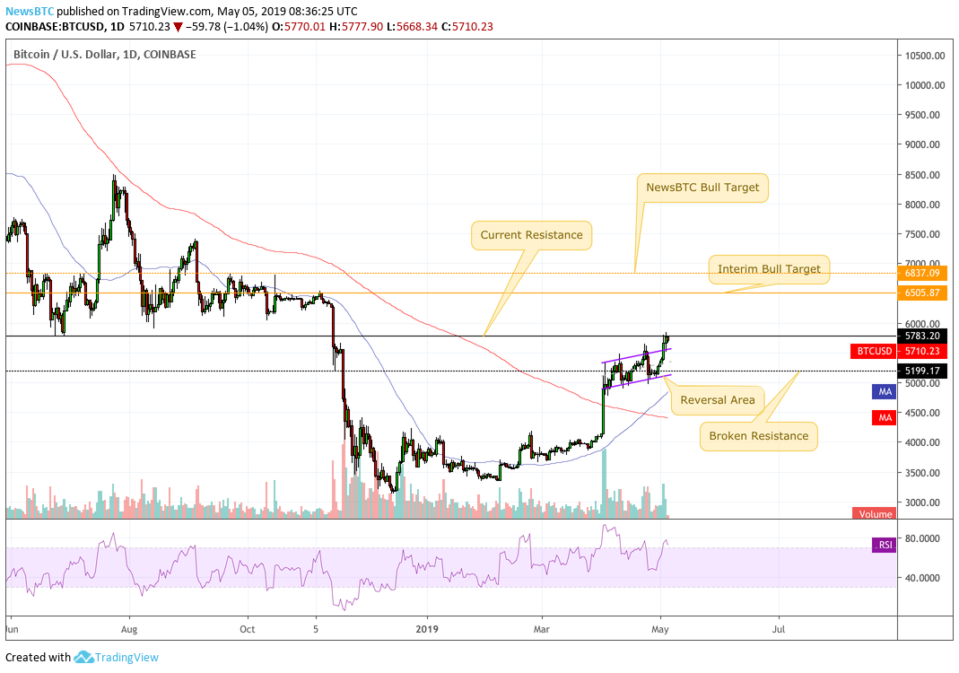 The veteran commodity trader Saturday that the was meeting its crucial resistance level near $5,745, as shown in the chart below. There was a strong probability of the asset undergoing a reversal, which loosely means that traders were not confident to purchase bitcoin at its higher rate. Therefore, the ones who bought the asset near $5,000-support might want to exit their positions on a handsome $745-per-bitcoin profit – more or less.