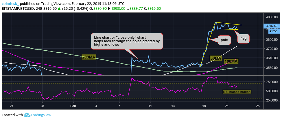 - bitcoin’s low-volume price consolidation has taken the shape of a bull flag on the 4-hour chart. A break above $3,930 would confirm a flag breakout and open the doors to $4,330 (target as per the measured move method).