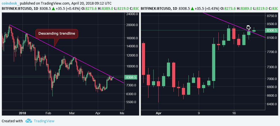 The daily chart below shows bitcoin closed yesterday at $8,273 on Bitfinex, meaning the breakout remained elusive. However, a new 24-hour candle (as per UTC) opened above the descending trendline support (seen today at $8,230), creating a false picture of a bullish breakout.