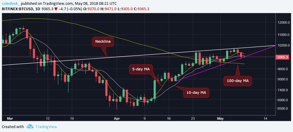 As a result, the cryptocurrency looks likely to find acceptance below the ascending trendline (drawn from the April 18 low and May 1 low) and possibly drop below the $9,000 mark in the next 24 hours or so.