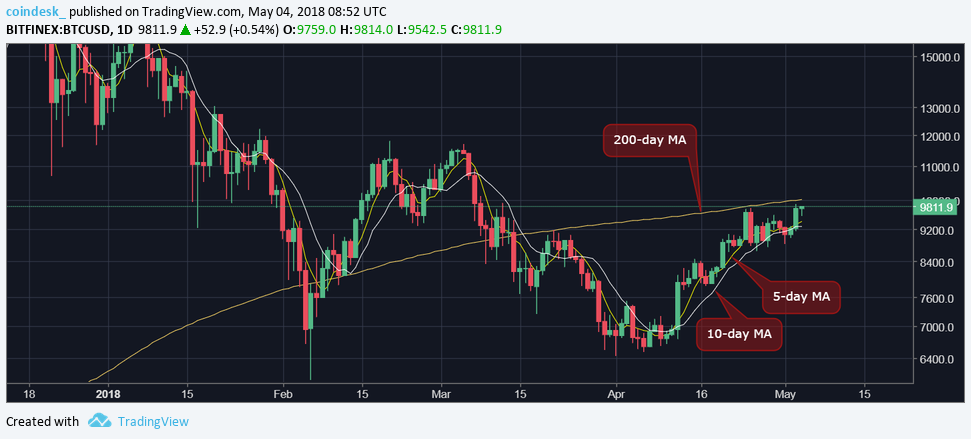 The cryptocurrency also clocked a two-month high of $9,875 yesterday. At time of writing, BTC is changing hands at $9,776 and remains on the hunt for a big break above the $10,000 mark, as indicated by the bullish setup in the technical charts below.