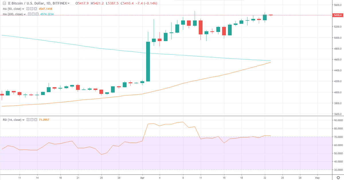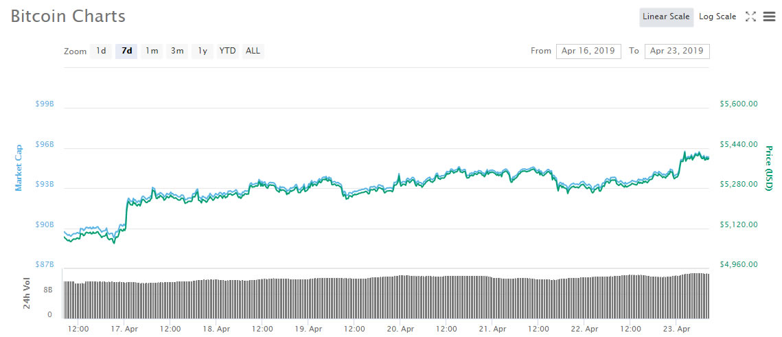According to bitcoin matched its 2019 high of $5,450 a few hours ago before starting to retreat a little. A surge a few hours later took BTC to a new high of $5,640 just above the 50 week moving average. Daily volume is now over $15 billion and has reached its highest level for the week. The bulls are leading things at the moment.