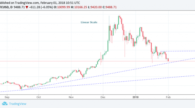 The same trendline support is seen around $5,700 on a linear (arithmetic chart below). However, linear charts tend to be a bit distorted with fast-moving assets like bitcoin.