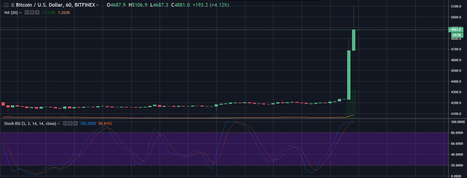 The move took less than an hour for BTC to break through $4,200 and surge in one almighty green candle up to and exceeding $5,000 according to charts on . This is a critical level as it has surpassed the 200 EMA which was sitting just below $4,700. A mini pullback occurred as expected and bitcoin leveled out around $4,700 before lifting off for a second pump. Coinmarketcap reports BTC has being up 15% on the day trading at just under $4,800.