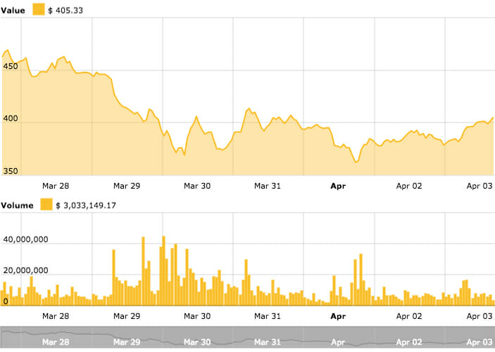 ETH is up a little more than 4 percent over a 24 hour period, trading at around $406 by press time.