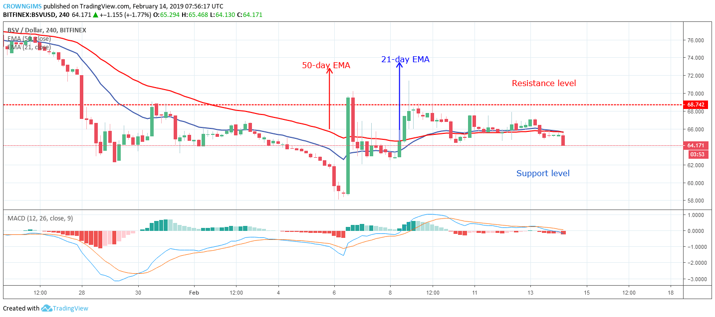 bitcoin SV/USD is also ranging on the medium-term outlook. The sideways movement started on February 6 when the bearish momentum rejected the further increase in the price of bitcoin SV. The bears and the bull’s momentum were within the range of $68 resistance level and $54 support level.