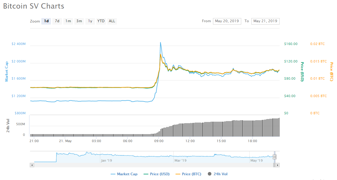 bitcoin SV gained 125% in the space of two hours on Tuesday, as the ‘Faketoshi’ news filtered through. That carried BSV from a daily low of $61.76 to a six-month high of $139.31.