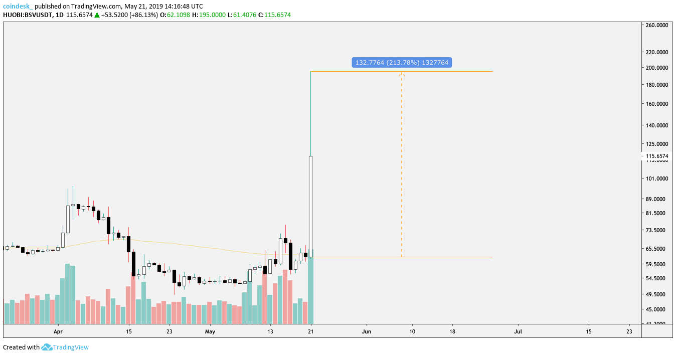 On some exchanges, however, BSV’s sudden price surge was even more drastic, increasing as much as 214 percent to reach $195 in the BSV/USDT market on the Singapore-based cryptocurrency exchange Huobi.