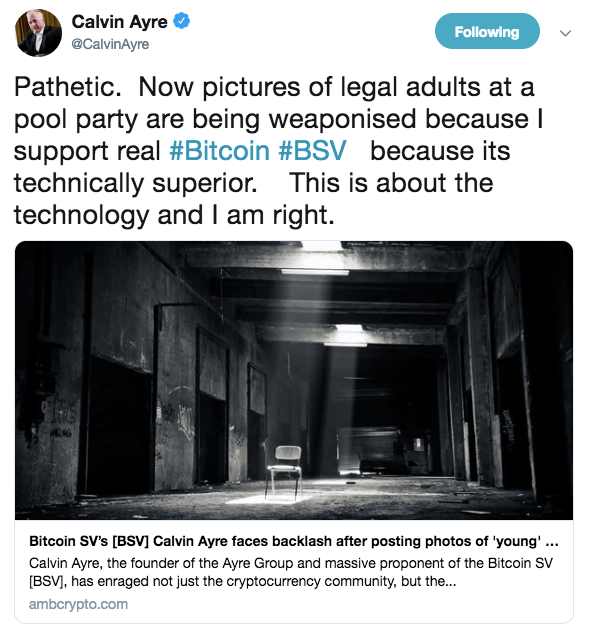 Calvin Ayre, the Founder of the Ayre Group, defended his 12 March tweets about a pool party with “young” women. Crypto-proponents were vocal in their displeasure towards Ayre’s pictures and video, and pushed back against the bitcoin SV [BSV] spearhead.