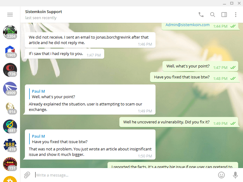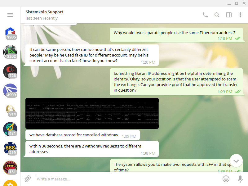 We continue our conversation via Telegram, after the exchange administrator confirms my identity.