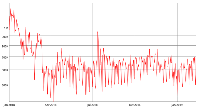 Wir sehen, dass das tägliche Transaktionsvolumen kaum gemeinsam mit der Transaktionsanzahl stieg. Die durchschnittliche Transaktionsgröße ist also gesunken.