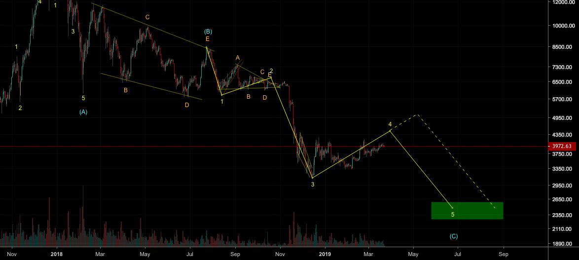 When we consider an correction that means a 5-3-5 structure. So I find myself in the C wave trying to finish the 4th wave. The second wave of C was a complex triangle which concludes that 4th has to be simple. That’s why I still think that 4500-5200 range is possible. But we can directly pass those prices and go down to 2k’s.
