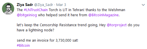 The Lightning Torch has been passed on to another Iranian, Ziya, now. The whole scenario over the past week up until Ziya receiving the torch, indicated a clear picture of the Lightning Networks transparency towards complete decentralization as the project overcame a major censorship issue within the span of a week.
