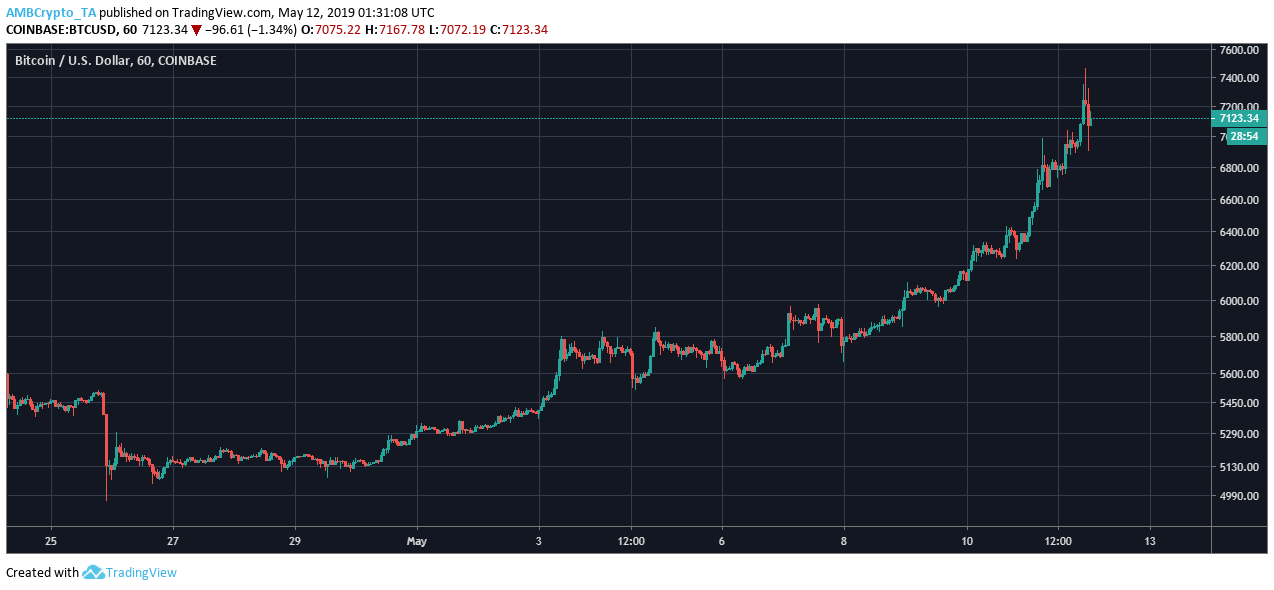 At press time, the one-hour chart of bitcoin showed a small correction in play after hit a high of $7,464. However, the price was currently at $7,132.