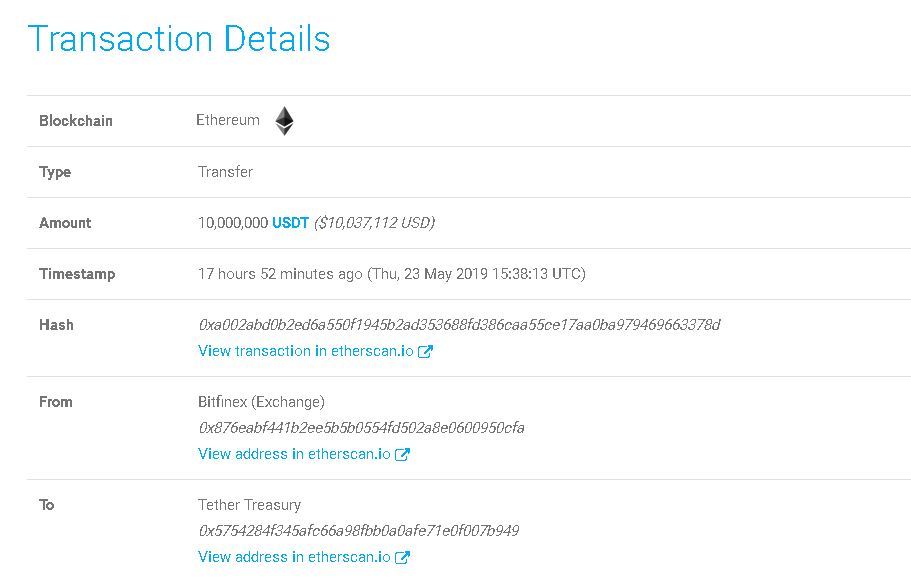 The first transfer that took place between Bitfinex and Tether was of 10,000,000 USDT, which was worth $10,037,112 USD and was transferred from Bitfinex’s wallet address, 876eabf441b2ee5b5b0554fd502a8e0600950cfa, to Tether’s wallet address, 5754284f345afc66a98fbb0a0afe71e0f007b949. The hash of the transaction was a002abd0b2ed6a550f1945b2ad353688fd386caa55ce17aa0ba979469663378. The time of the transaction was 15:38:13 UTC.