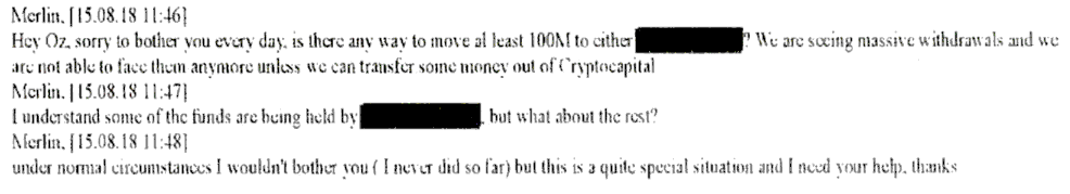 In October 2018, rumors about Bitfinex’s insolvency started surfacing and were outrightly denied by Bitfinex in their dated October 07, 2018. Under the hood, however, Bitfinex’s top executive “Merlin” was “beseeching” an individual at Crypto Capital named “Oz”.