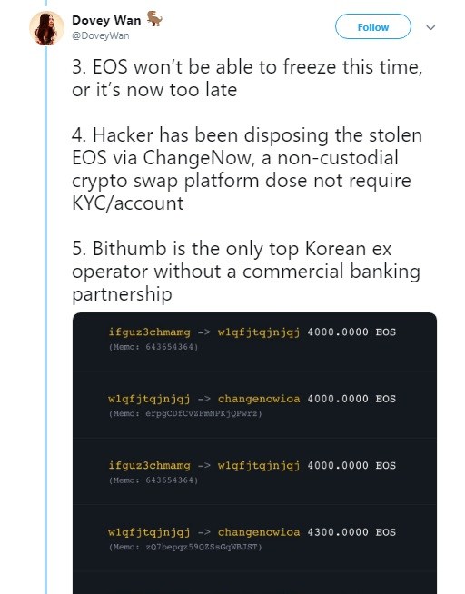 Immediately after Bithumb intimated ChangeNOW and other crypto-exchanges about the hack, the Belize-based exchange temporarily disabled EOS and XRP deposits, while also blacklisting the list of malicious addresses.