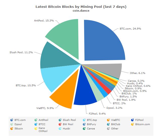 Collectively, these three pools account for more than 50 percent of BTC blocks mined over the past seven days, and this level of centralization is one reason that Bitmain has become a flashpoint in many cryptocurrency circles.
