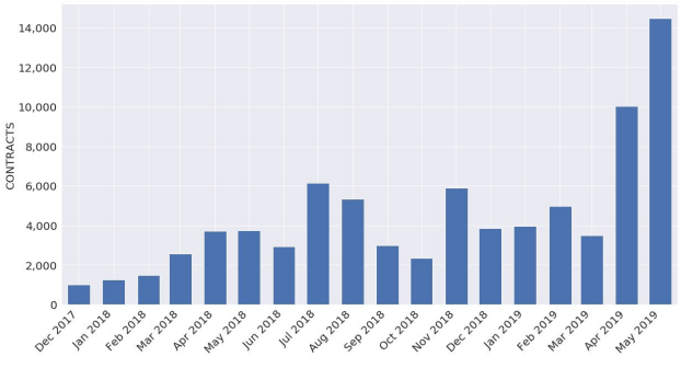 On a month-on-month basis, bitcoin Futures saw a massive bump in April trading at an average of 10,000 contracts daily, peaking on April 4, with over 22,000 contracts traded. To put that number in perspective, in March 2019, the average contracts traded was less than 4,000. Despite the high standards set in April, the average daily contracts traded in May, with 25 days gone has exceeded 14,000 and still looks to grow, given the price performance of bitcoin.