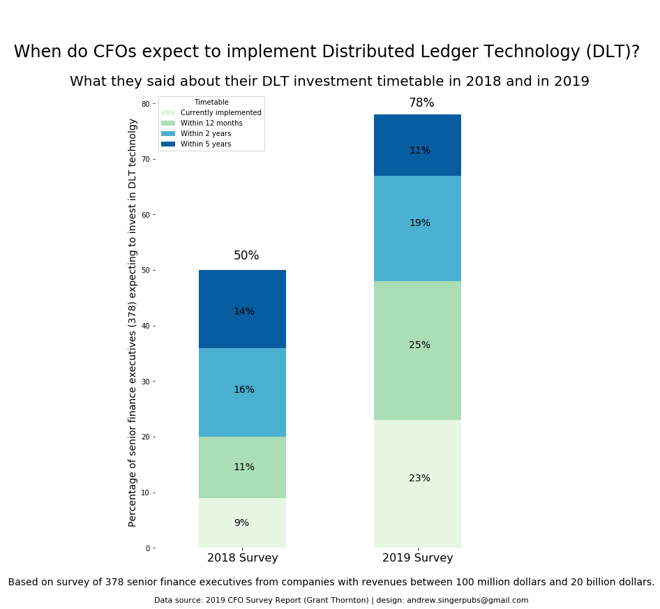 It’s rare in annual surveys that outcomes surpass predictions, but this was the case with DLT. In 2018, 11% of CFOs “predicted” their companies would adopt DLT ‘within the next 12 months.’ In point of fact, 14% implemented DLT the following year.
