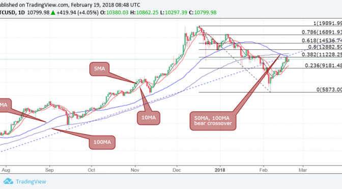 - Meanwhile, a drop below $9,017.41 (Jan. 17 low) would add credence to the bearish weekly RSI, and the bearish 50-day MA and 100-day MA crossover, and could yield a deeper sell-off towards $7,000.
