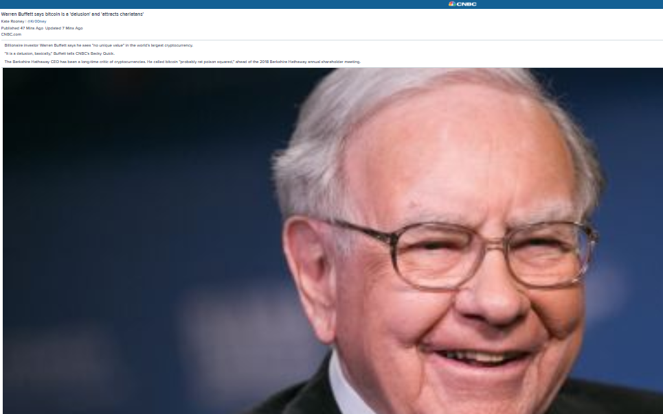 “Blockchain is important but bitcoin has no unique value at all,” Buffett told CNBC’s Becky Quick in a “Squawk Box” interview Monday. “It is a delusion, basically.”