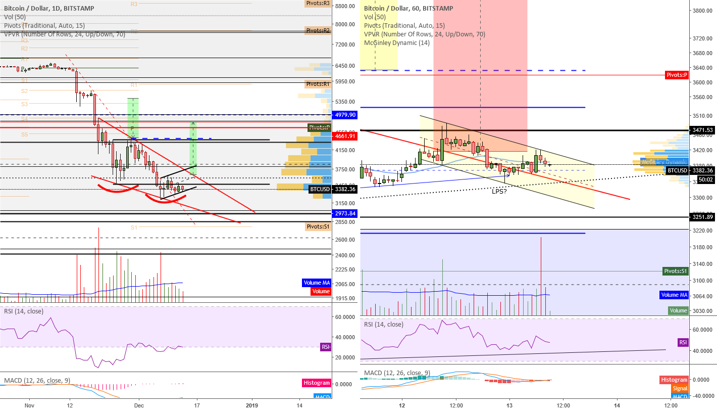 Good morning, traders. continues to move sideways as it retraced overnight and found support around the descending red previous resistance line as mentioned it was likely to do during yesterday morning’s live stream. This morning, we can see price rising and, now, sitting around the Dynamic line and HVNs. Traders who were paying attention noticed the 1H in and its histogram, noted by the blue arrow on price, and were able to profit by going long at that time. Currently, any move by price below the ascending dotted black line should have traders watching the December 11th swing low at $3292.65. A 1H close below that should have price targeting the blue December 7th swing low at $3210, with a 1H close below that signalling a likely test of the $3000 level. A close above the descending yellow channel that price is printing should have it targeting the 1H at $3617.52. A close above that should leave price targeting the $3970-$4025 area. The 1H is attempting a cross at this time as well.
