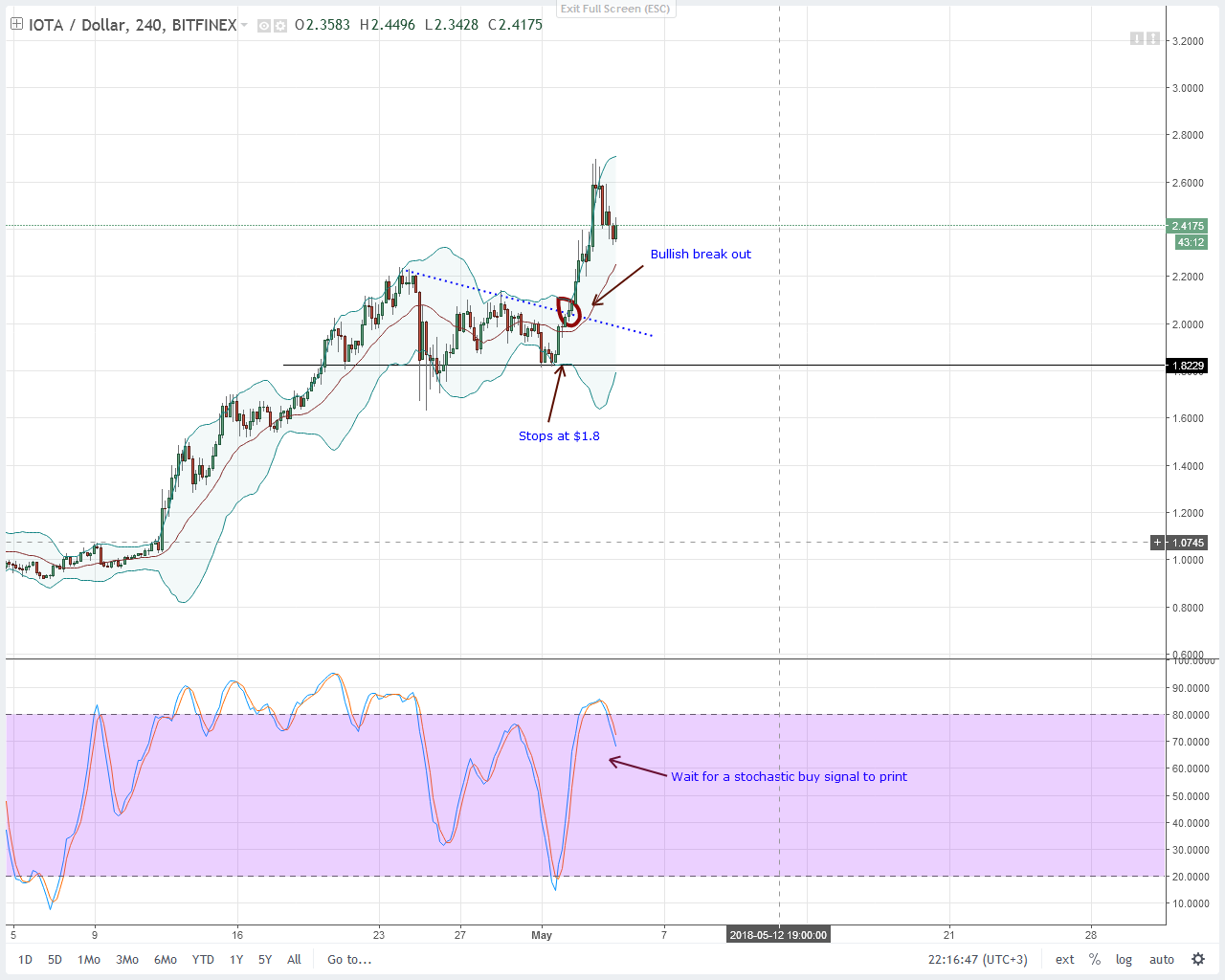 Is Huobi’s postponement of IOTA trading affecting this bull momentum or people are now shifting their money to bitcoin? I don’t really know and until I have to ropes to give a solid explanation, I expect this slide to continue this weekend. From our technical analysis, our first layer of support lies at $2.2. However, if sell pressure melt through it, then we can as well wait until a stochastic buy signal prints. In fact that’s what I’m rooting for.