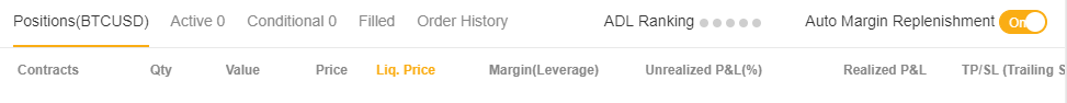 In the “Positions” tab, traders are able to check their ranking in the ADL system; this is represented by a number of bright dots. Each dot represents your priority in 20% increments; when all 5 lights are lit this indicates that your position is in the top percentile of the ADL queue. Traders can lower their ranking by reducing their leverage or closing some of their positions.