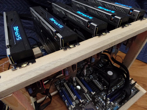 bitcoin mining rig made up of 5 rx480 gpus.