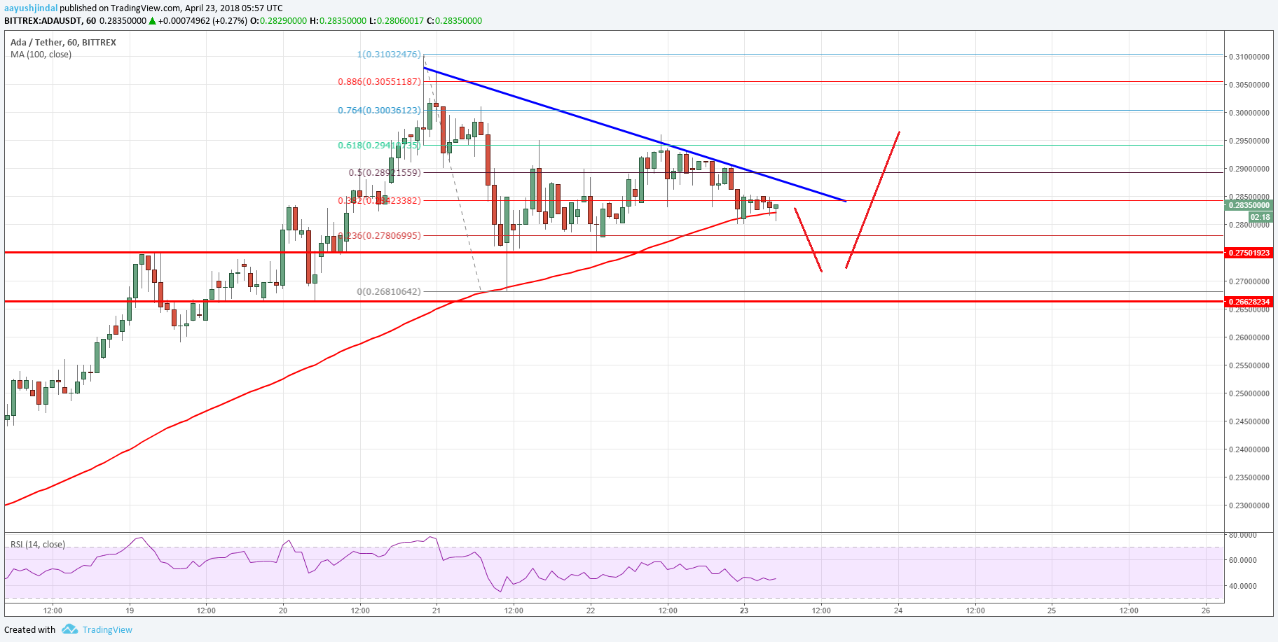 - There is a short-term bearish trend line forming with resistance at $0.2850 on the hourly chart of the ADA/USD pair (data feed via Bittrex).