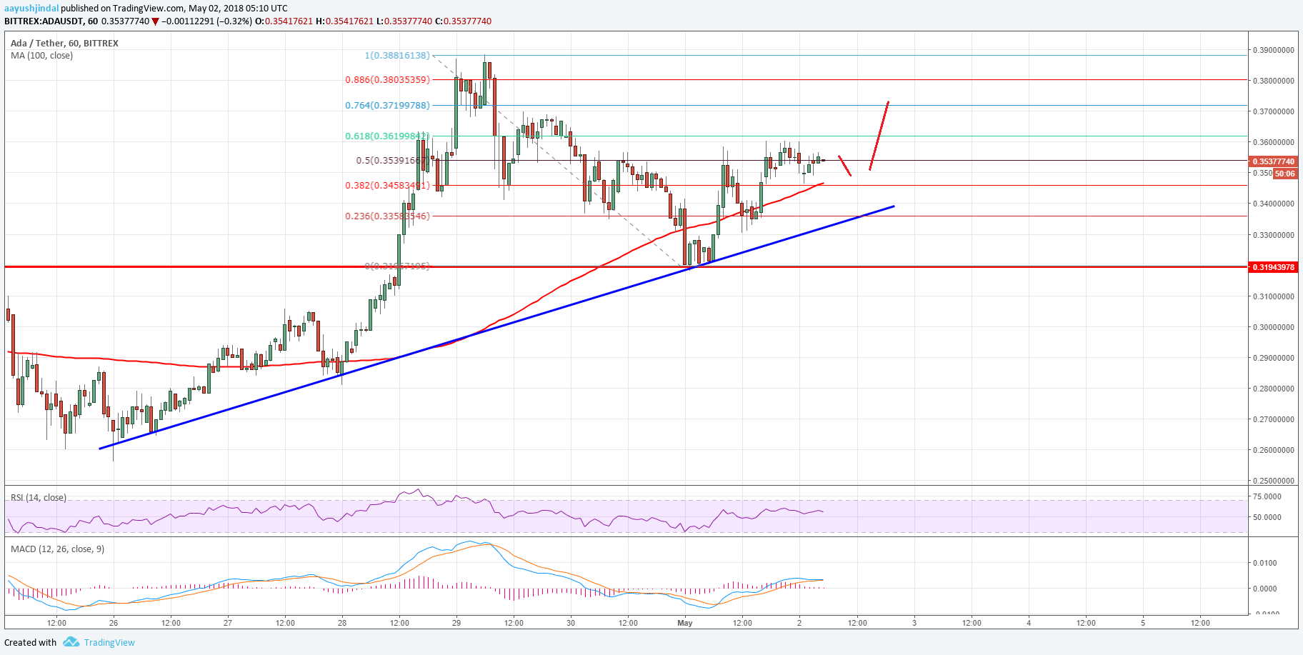 After a , ADA price found support near $0.3200 against the US Dollar. The mentioned $0.3200 acted as a strong barrier for sellers and protected further declines. Moreover, the 61.8% Fib retracement level of the last leg from the $0.2810 swing low to $0.3880 swing high also acted as a support. The price formed a support base at $0.3200 and started an upside move.