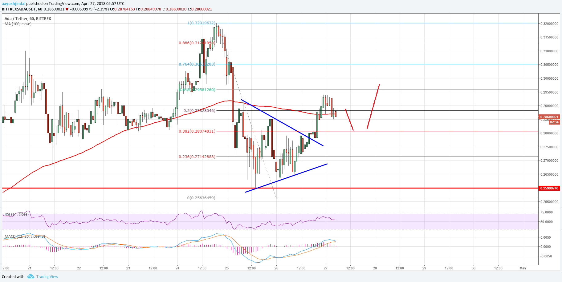 More importantly, there was a break above a short-term contracting triangle with resistance at $0.2750 on the hourly chart of the ADA/USD pair. The pair traded further higher and broke the $0.2850 resistance. At the moment, it is trading near the 100 hourly simple moving average and $0.2900. On the upside, there is a major hurdle near $0.3000. However, a proper close above the 61.8% Fib retracement level of the last decline from the $0.3201 high to $0.2563 low is required. Once the breaks $0.2950 and $0.3000, there could be .