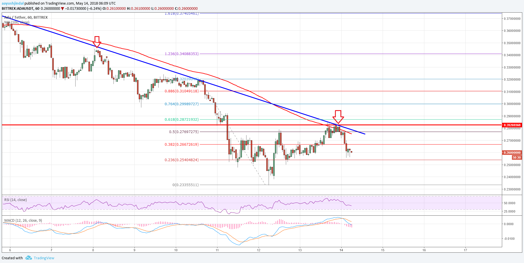 - There is a crucial bearish trend line forming in place with resistance at $0.2750 on the hourly chart of the ADA/USD pair (data feed via Bittrex).