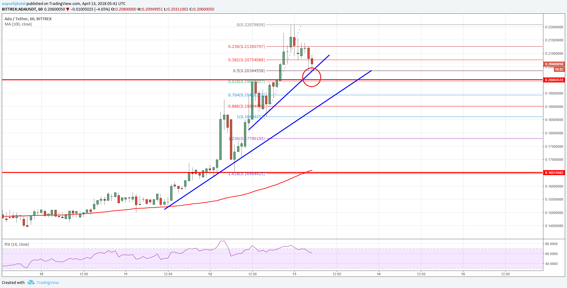 The past few sessions were since there was a sharp rise in ADA price from the $0.1650 low against the US Dollar. The price surged higher and broke two important hurdles near the $0.1800 and $0.2000 level. The upside move was strong since the price even broke the $0.2150 level. A high was formed at $0.2207 before the price started a downside move.