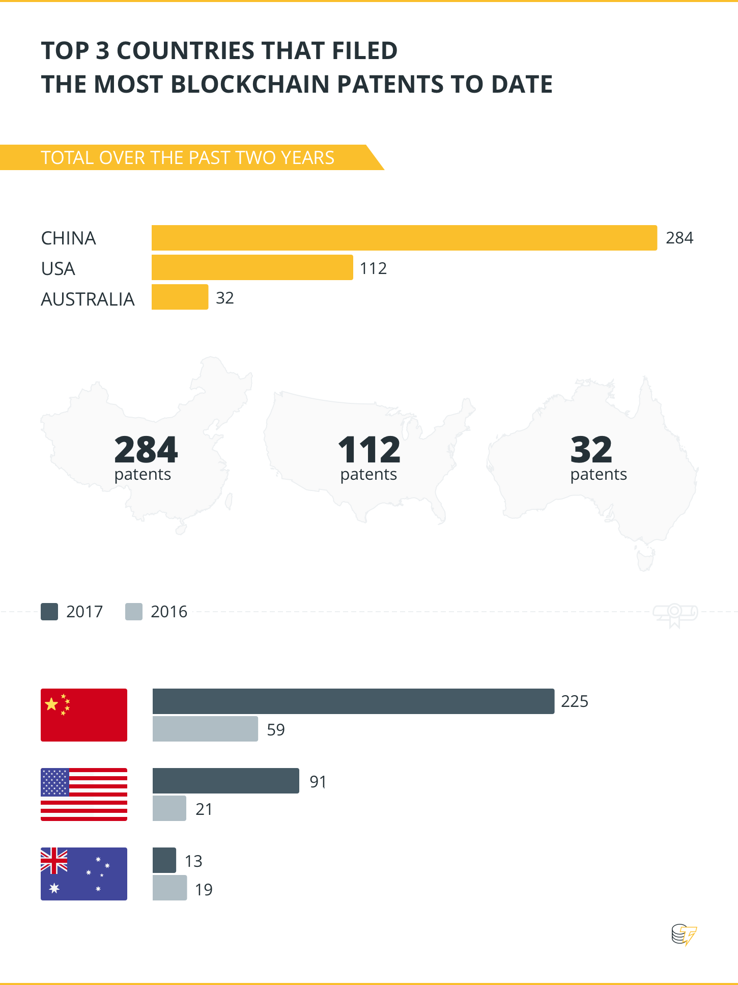 According to Thomson Reuters and the World Intellectual Patent Organization, China has about 400 Blockchain-related patents, which it has garnered within the past two years. The US and Australia have the second largest number of blockchain patents with 110 and 40 respectively.