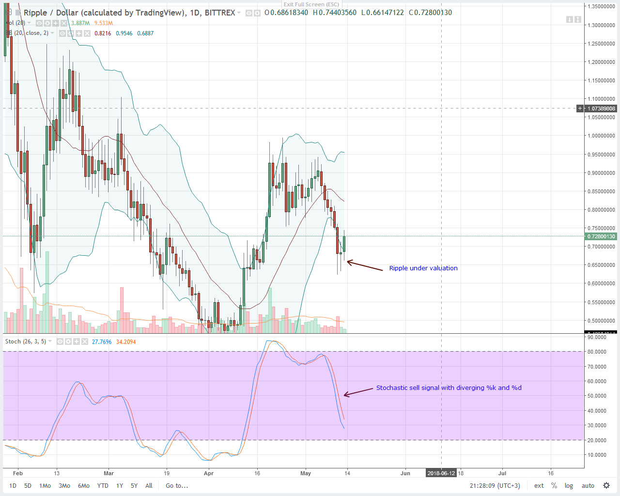 There is a little bit of under-valuation in the daily chart following May 12 close below the lower BB. The thing, prices are somehow over-extended after dipping 30 cents right from our resistance line at $1. We are net bearish but temporarily, prices might recover and test 85 cents in the coming days.