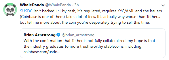 Twitter user, @WhalePanda, responded to Brian Armstrong’s tweet and responded that $USDC was even worse than Tether, since it was not backed 1:1 by fiat currency. USDC was majorly centralized and it was regulated, he added.