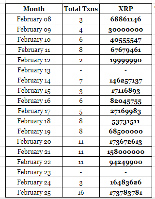 On February 25, out of the total 16 transactions that took place, 9 transactions occurred a few hours before the announcement. Although the transactions were into multiple wallets, they cumulatively amounted to 88,743,691 XRP. XRP was trading anywhere between $0.29 to $0.30 on February 25, resulting in a total of $25,735,670.39 being accumulated before the announcement.