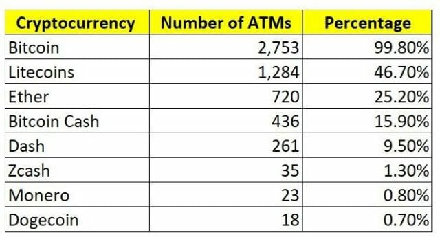 Moreover, a growing number of machines are also providing support to other cryptocurrencies. Coin ATM Radar delivers the following statistics: