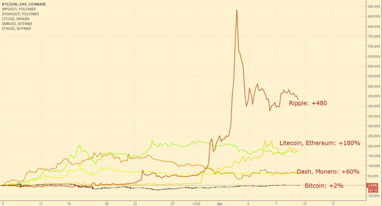 Litecoin is consolidating near the $10 level this weekend, and it jumped to the second place in the monthly performance chart of the major altcoins after its strong breakout, teaming up with Ethereum with a gain of 180%. Ethereum has been relatively quiet this week as it remains in a holding pattern below the $50 level. bitcoin’s climb towards the $1200 level was impressive last week, but the dominant player of the market might face strong resistance before a charge towards its all-time high.
