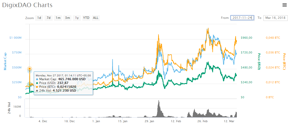 Lo interesante ocurre justamente a inicios de 2018, ya que en un momento en el que la mayoría de las monedas digitales comienzan a perder notablemente su valor, DigixDAO mantiene una tendencia alcista pese a las fluctuaciones en sus precios, llegando a registrar el valor más alto en su historia el 1ro de marzo, cuando su precio superó los USD $590 por unidad.