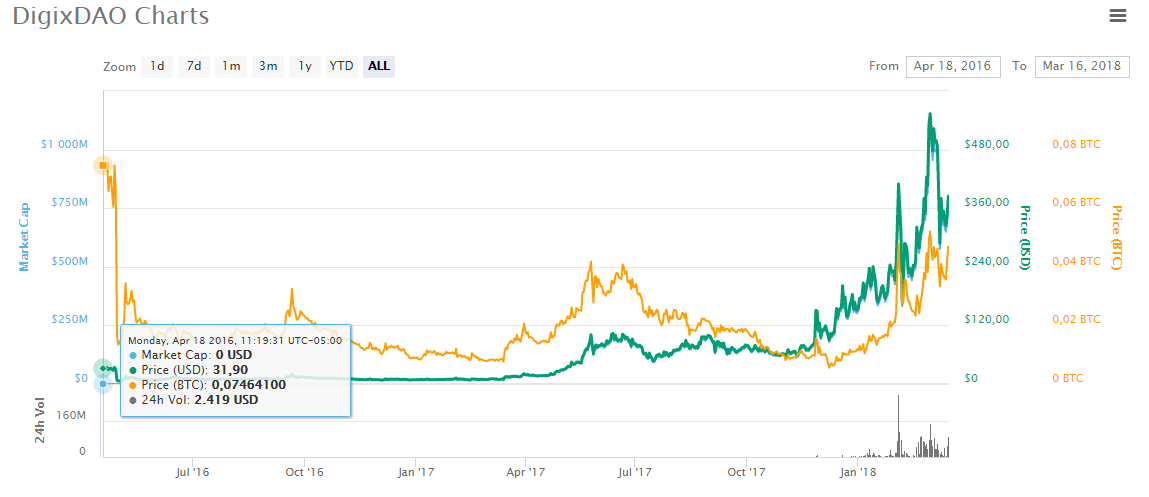 DigixDAO originalmente hizo su entrada en los mercados exactamente el 18 de abril de 2016, poco más de dos semanas después de que se realizara su primera pre venta. Para ese entonces su valor unitario era de USD $31,9, bastante elevado tomando en cuenta la historia de las principales criptomonedas en sus inicios.
