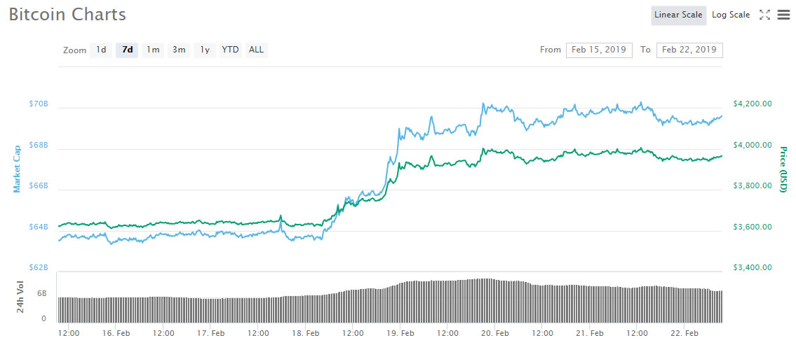 bitcoin price and volume over past 7 days from Coinmarketcap.com