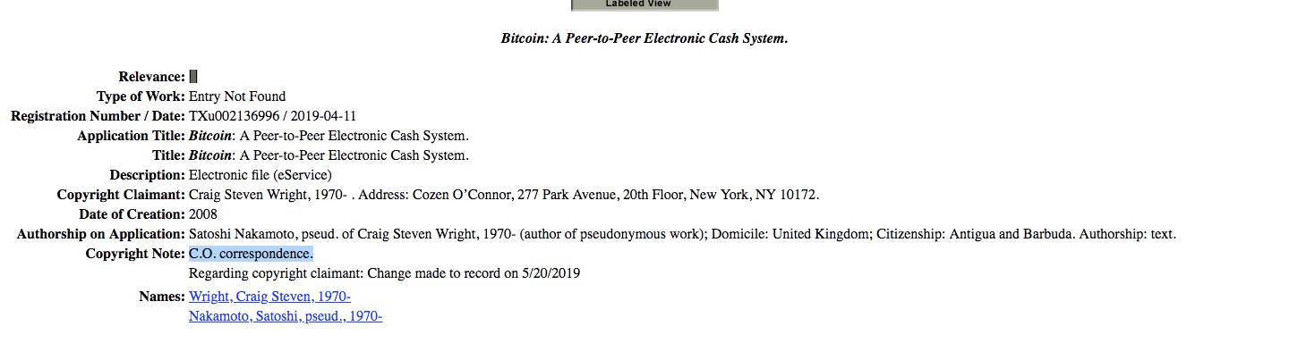Interestingly, CoinGeek published an titled, “bitcoin creator Craig S. Wright (Satoshi Nakamoto) granted US copyright registration for bitcoin white paper and code.” Further, the blog post also claimed that the U.S Copyright office was the first government office to recognize “Craig Wright as Satoshi Nakamoto, the creator of bitcoin.”