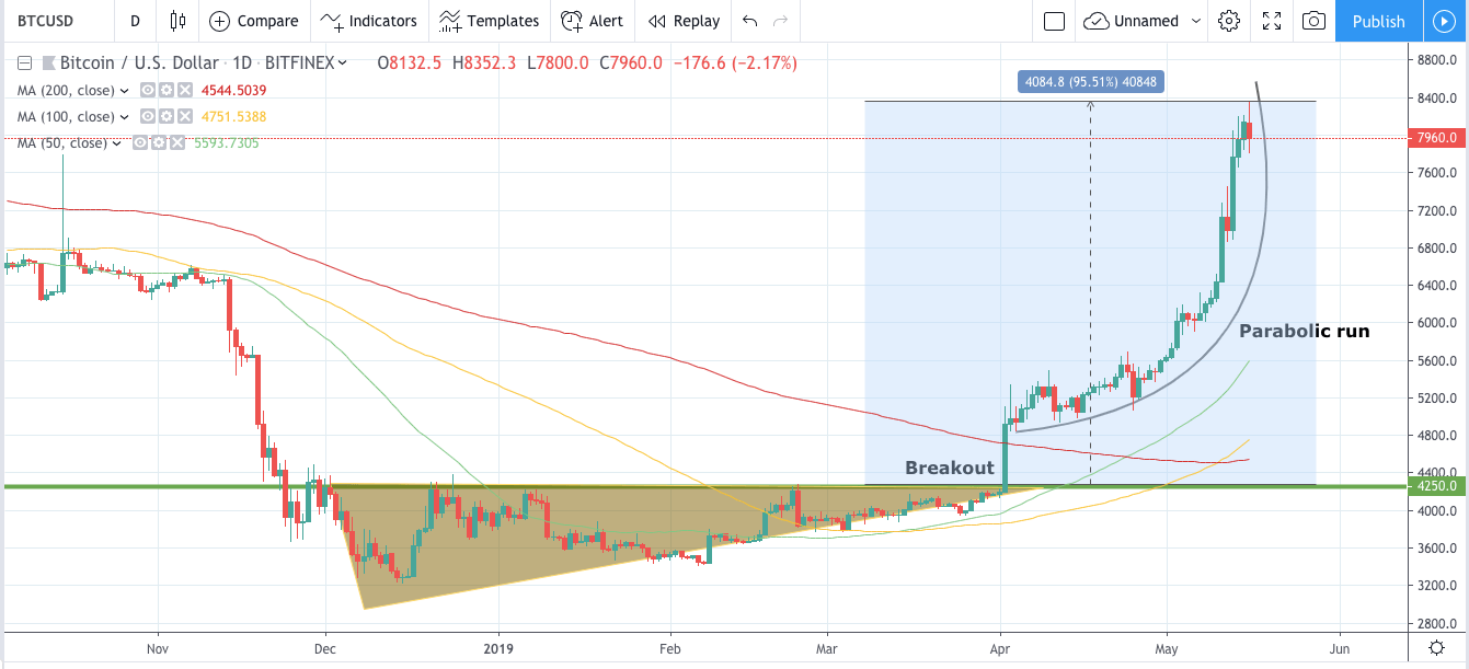 Before bitcoin ignited its current parabolic run, it first painted a large ascending triangle pattern on the daily chart. It took the market five months before it broke out of the pattern. When it did, the coin’s value skyrocketed by almost 95% in a month and a half. The breakout marked bitcoin’s technical reversal.