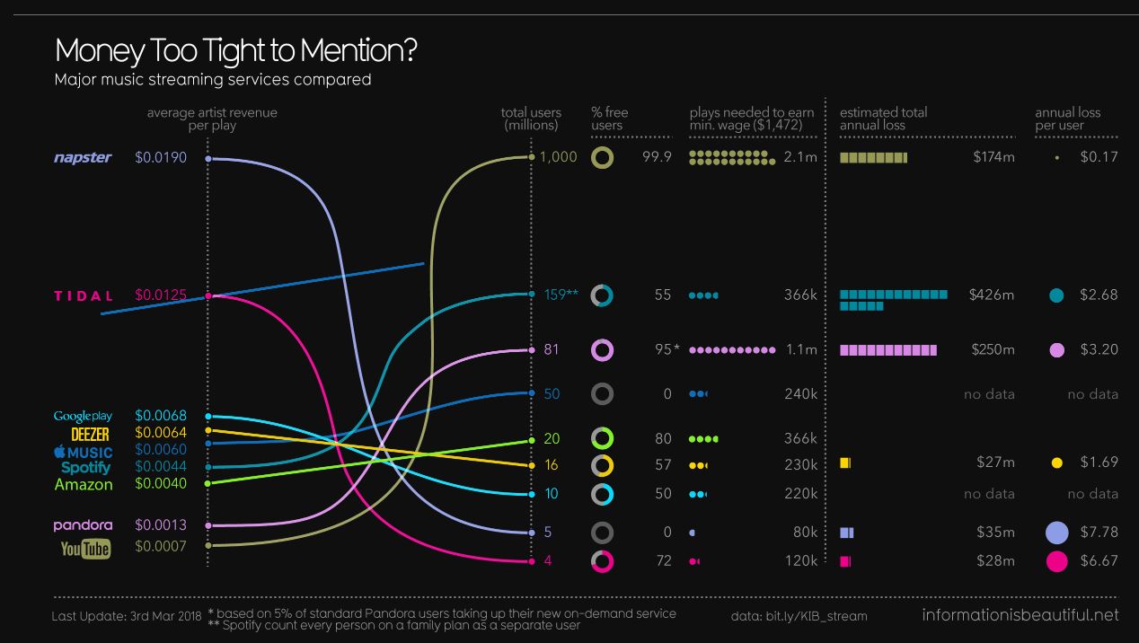 Number of streams required to make weekly minimum wage, sorted by platform. | Source: Information is Beautiful