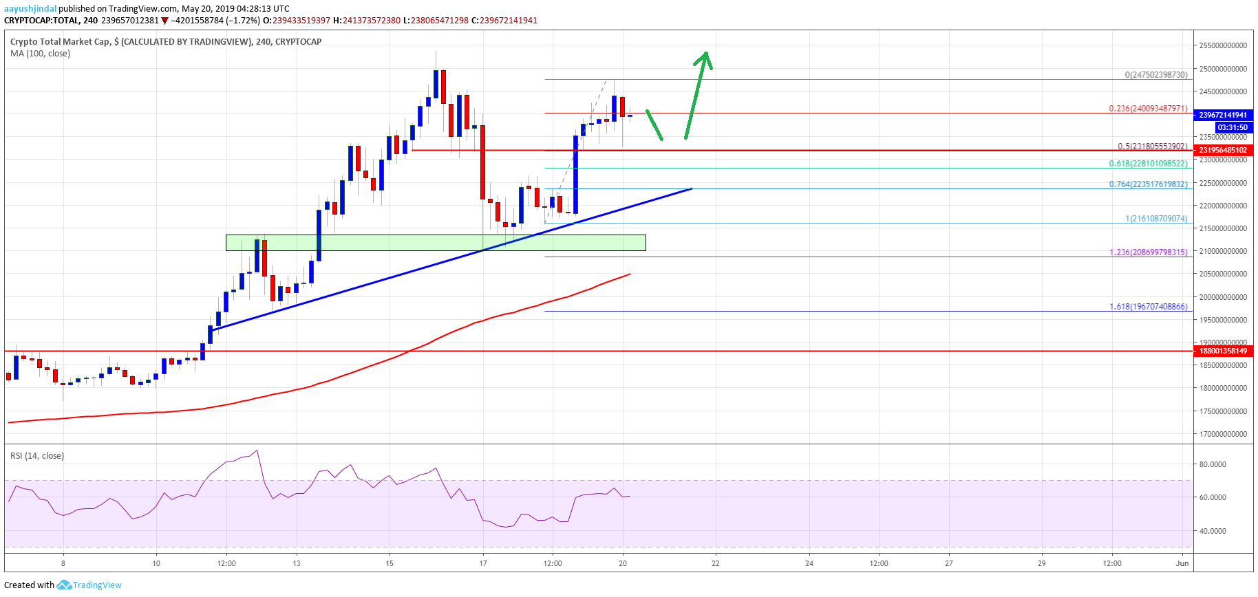 Looking at the total cryptocurrency market cap hourly , there was a sharp upward move above the $220.0B and $230.0B resistance levels. The trend line and support near $210.00 and $215.0B proved significant, resulting in a strong upward move. The market cap is now above the $235.0B level and it recently tested the $247.0B level. In the short term, there could be a downside correction, but the $230.0B level is likely to act as a strong support. On the upside, there are many hurdles near $248.0B and $250.0B, above which the market cap could rally to $260.0B. Overall, there could be more upsides in bitcoin, Ethereum, EOS, ripple, litecoin, bitcoin cash, XLM, TRX, BNB, WAN, WTC, ICX, and other altcoins in the near term.