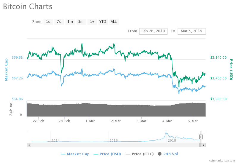 bitcoin has recovered from earlier losses, currently trading at $3,874.59 and up 2.87% after sinking below $3,733.00 on Monday.