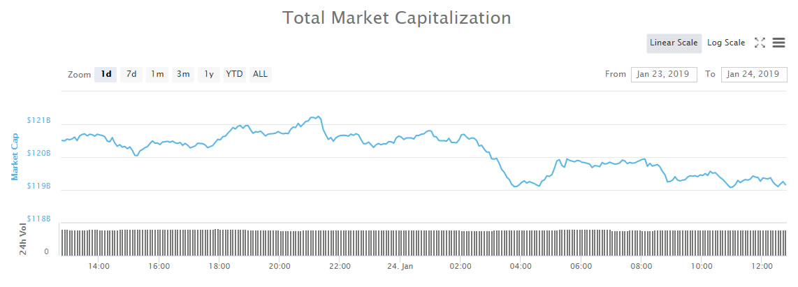 Total market capitalization is back at $119 billion after losing over a percent on the day. Things were equally inactive this time last Thursday and there has been little movement all week. Since the post-Christmas dump markets have been range bound between $120 and $135 billion but they appear about to fall through the bottom of that channel at the moment.